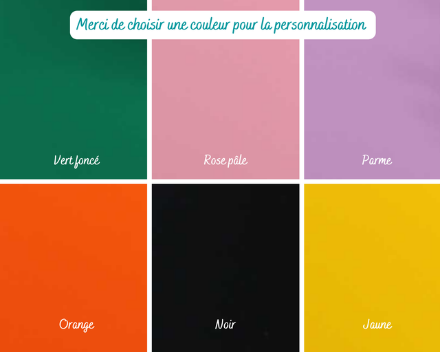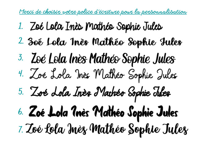 ~> Si vous avez choisi la personnalisation de ce produit, un mail vous sera envoyé après validation de votre commande afin de préciser la police choisie ainsi que la couleur souhaitée (à choisir dans les photos de la présentation du produit). Pour toute question concernant la personnalisation vous pouvez m'envoyez une demande via le formulaire de contact.